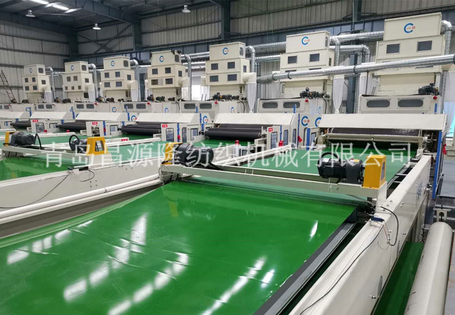 5. CYLPW-2200铺网机:机架采用6mm钢板折弯而成,铺网帘之间加补偿电机,减少纤网牵伸。往复换向用变频控制,冲击力小,能自动缓冲平衡换向,并配有多段速控制。底帘可调节升降,使棉网能按照所需要的单位克重均匀铺叠到底帘上,供下一道工序使用。斜帘﹑平帘和大车平帘用高档优质皮帘,底帘和环帘为木帘子。