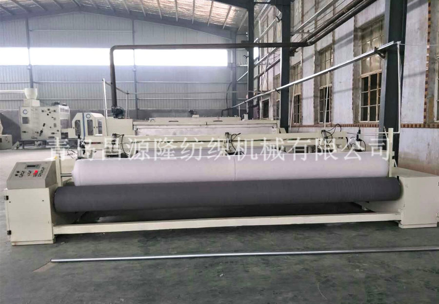 5. CYLPW-2200铺网机:机架采用6mm钢板折弯而成,铺网帘之间加补偿电机,减少纤网牵伸。往复换向用变频控制,冲击力小,能自动缓冲平衡换向,并配有多段速控制。底帘可调节升降,使棉网能按照所需要的单位克重均匀铺叠到底帘上,供下一道工序使用。斜帘﹑平帘和大车平帘用高档优质皮帘,底帘和环帘为木帘子。