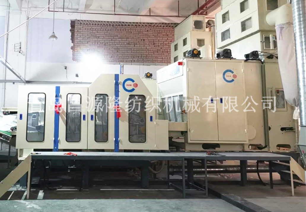 4. CYLSL-2000梳理机:该机为单锡林、双道夫、四杂乱、罗拉剥取。该机所有辊筒都经调质和定性处理后,再精密加工。墙板由铸铁加工而成,针布采用国产优质针布,并配有吸风装置,可减少清机次数,还带有走台。具有分梳能力强,产量高等优点。