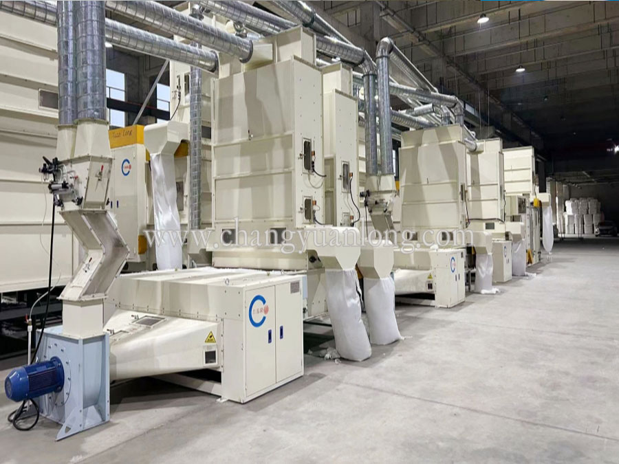 1. CYKB-1200 开包机:开松各种捆包纤维,按比例由电子秤进行称量,均匀平铺在混棉帘上。各种不同纤维被放入水平输送帘,经压棉辊和对辊罗拉喂入,经高速打手开松后由输棉风机送到下道工序。