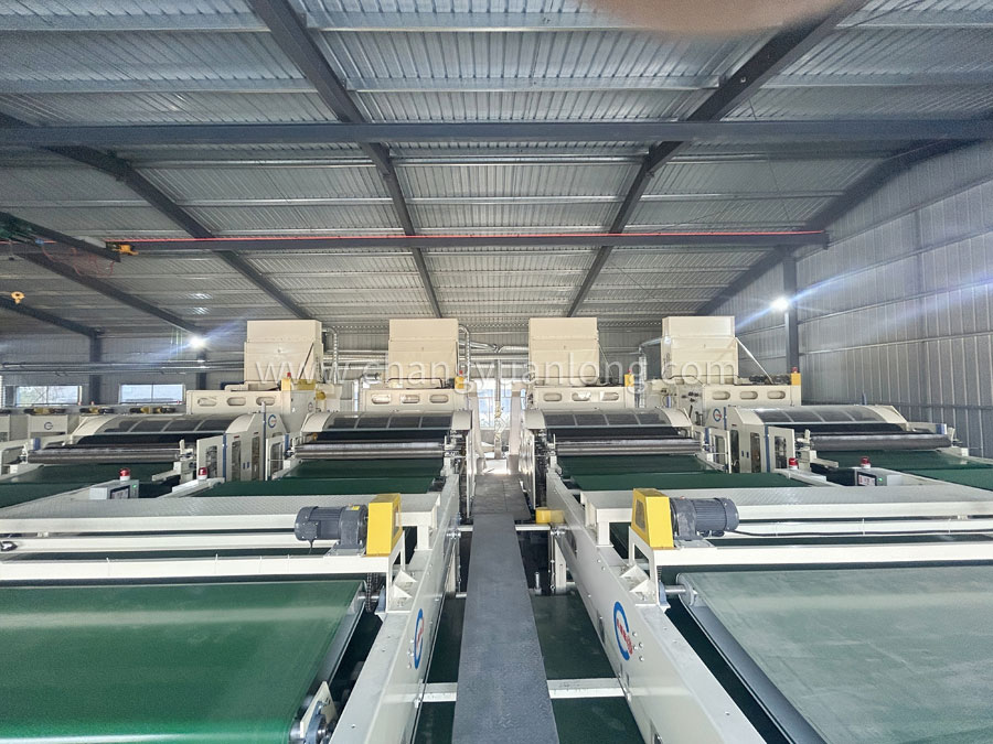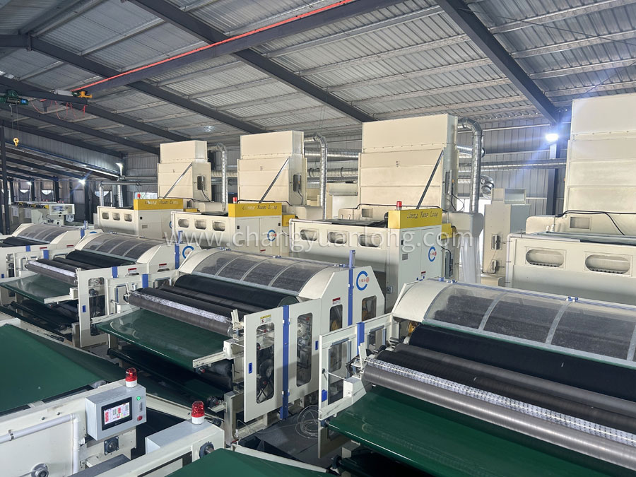 5. CYLPW-2200铺网机:机架采用6mm钢板折弯而成,铺网帘之间加补偿电机,减少纤网牵伸。往复换向用变频控制,冲击力小,能自动缓冲平衡换向,并配有多段速控制。底帘可调节升降,使棉网能按照所需要的单位克重均匀铺叠到底帘上,供下一道工序使用。斜帘﹑平帘和大车平帘用高档优质皮帘,底帘和环帘为木帘子。