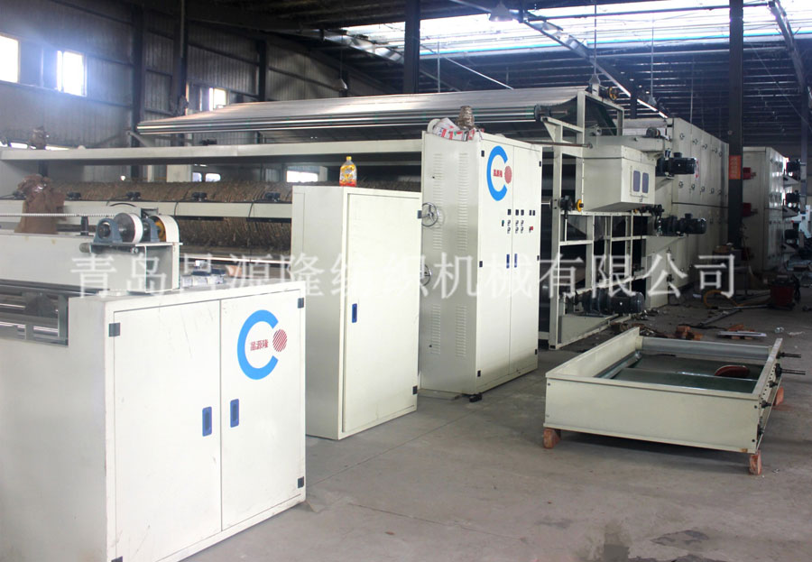 5. CYLPW-2200铺网机:机架采用6mm钢板折弯而成,铺网帘之间加补偿电机,减少纤网牵伸。往复换向用变频控制,冲击力小,能自动缓冲平衡换向,并配有多段速控制。底帘可调节升降,使棉网能按照所需要的单位克重均匀铺叠到底帘上,供下一道工序使用。斜帘﹑平帘和大车平帘用高档优质皮帘,底帘和环帘为木帘子。