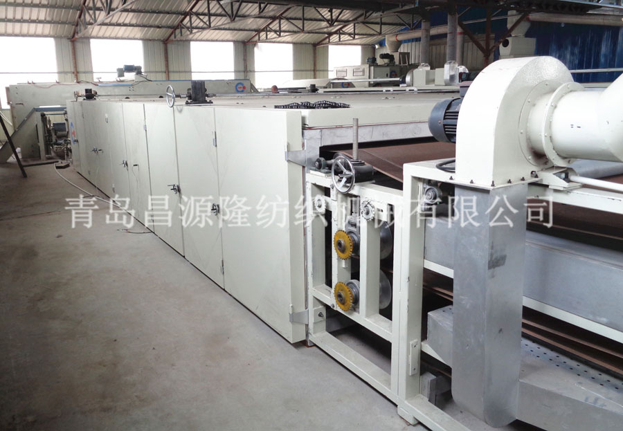 5. CYLPW-2200铺网机:机架采用6mm钢板折弯而成,铺网帘之间加补偿电机,减少纤网牵伸。往复换向用变频控制,冲击力小,能自动缓冲平衡换向,并配有多段速控制。底帘可调节升降,使棉网能按照所需要的单位克重均匀铺叠到底帘上,供下一道工序使用。斜帘﹑平帘和大车平帘用高档优质皮帘,底帘和环帘为木帘子。