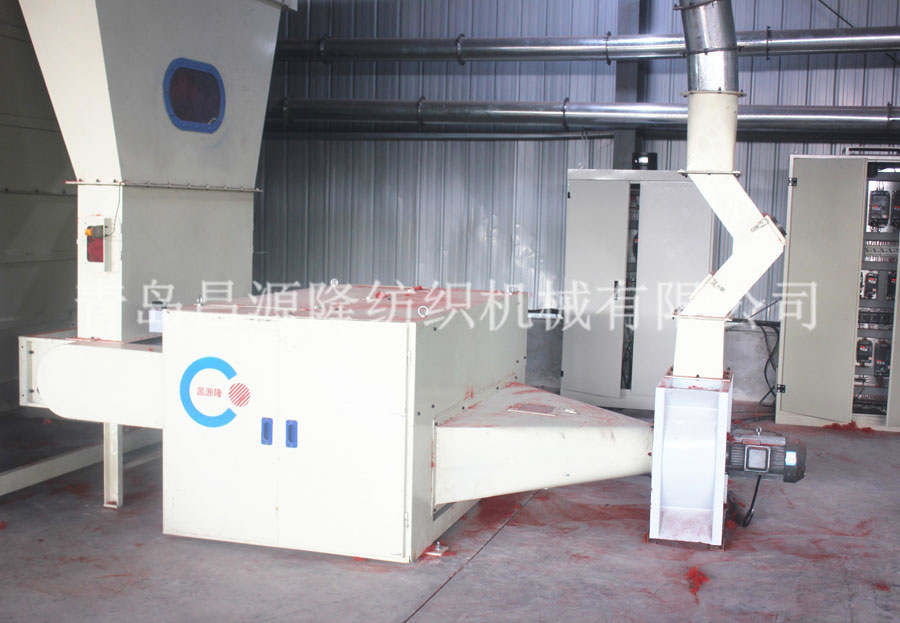 2. CYLKS-开松机:开松各种捆包纤维,按比例由电子秤进行称量,均匀平铺在混棉帘上。各种不同纤维被放入水平输送帘,经压棉辊和对辊罗拉喂入,经高速打手开松后由输棉风机送到下道工序。