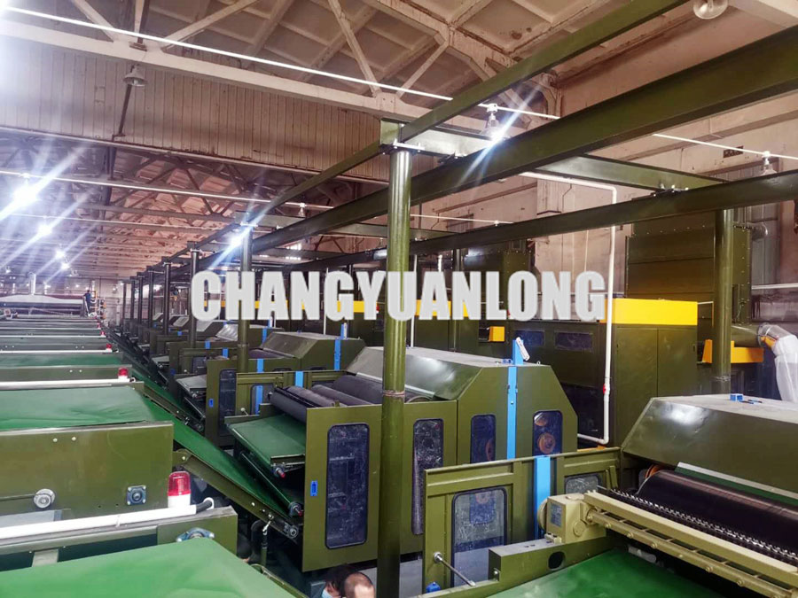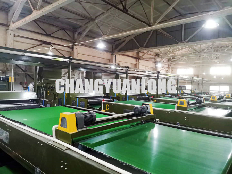 不同纤维经充分混合角钉帘输送,经上给棉罗拉送至开松辊进一步开松后落入下棉箱,经由振动筛,振实后形成筳棉层供梳理机使用。