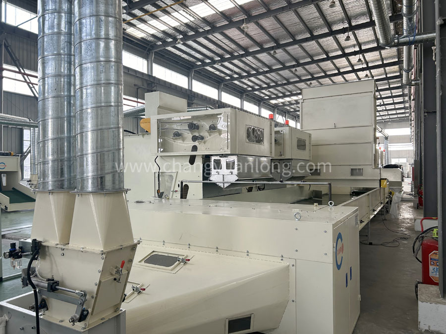 开松机:本机开松效果好,不易缠棉,产量高。把纤维、原料经喂入平帘输送至喂入罗拉,再由开松辊高速开松后,经输棉风机以适量的风量输送纤维原料供后道工作使用;并配备桥式除铁装备。